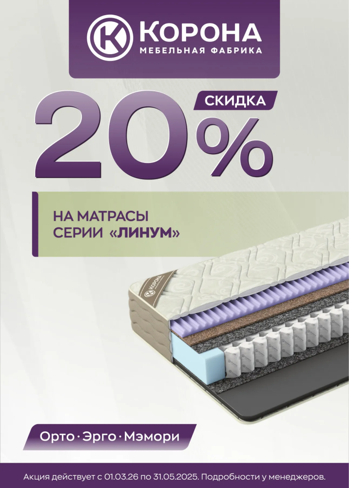 Спешим сообщить о старте выгодного предложения! Только до 31 мая 2026 года на все матрасы серии «Линум»: «Мемори», «Орто» и «Эрго» действует скидка 20%.